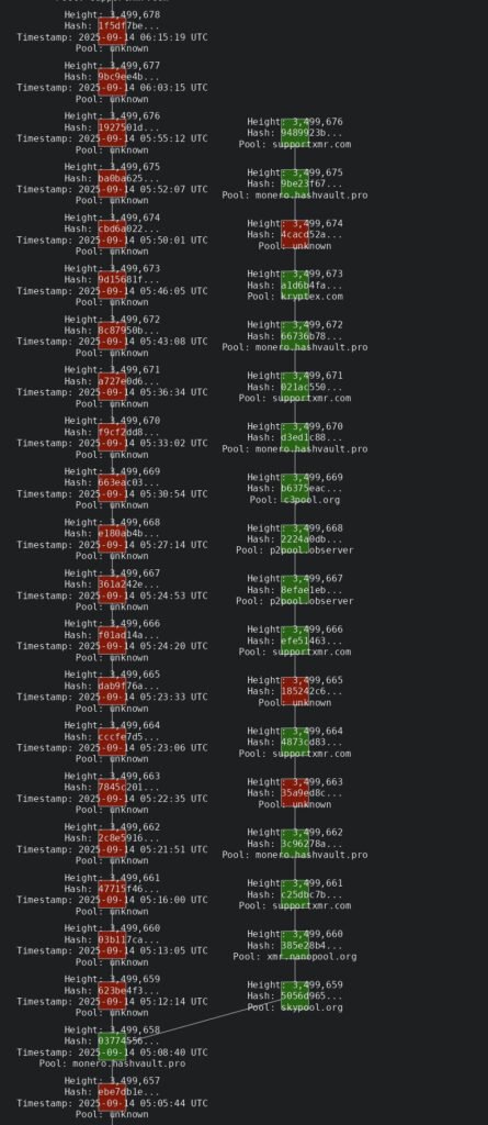 What you’re seeing in the image is a “timeline edit.” A blockchain grows like a line of stamped pages. Now and then the last pages can be replaced if a stronger line appears. That replacement is called a reorganization, or reorg. On September 14, Monero’s chain rewrote 18 pages at once—blocks 3,499,659 → 3,499,676—which invalidated 118 transactions. For many networks, losing that many fresh pages would be a crisis. After so much prior noise, it’s being treated as routine. It shouldn’t be.